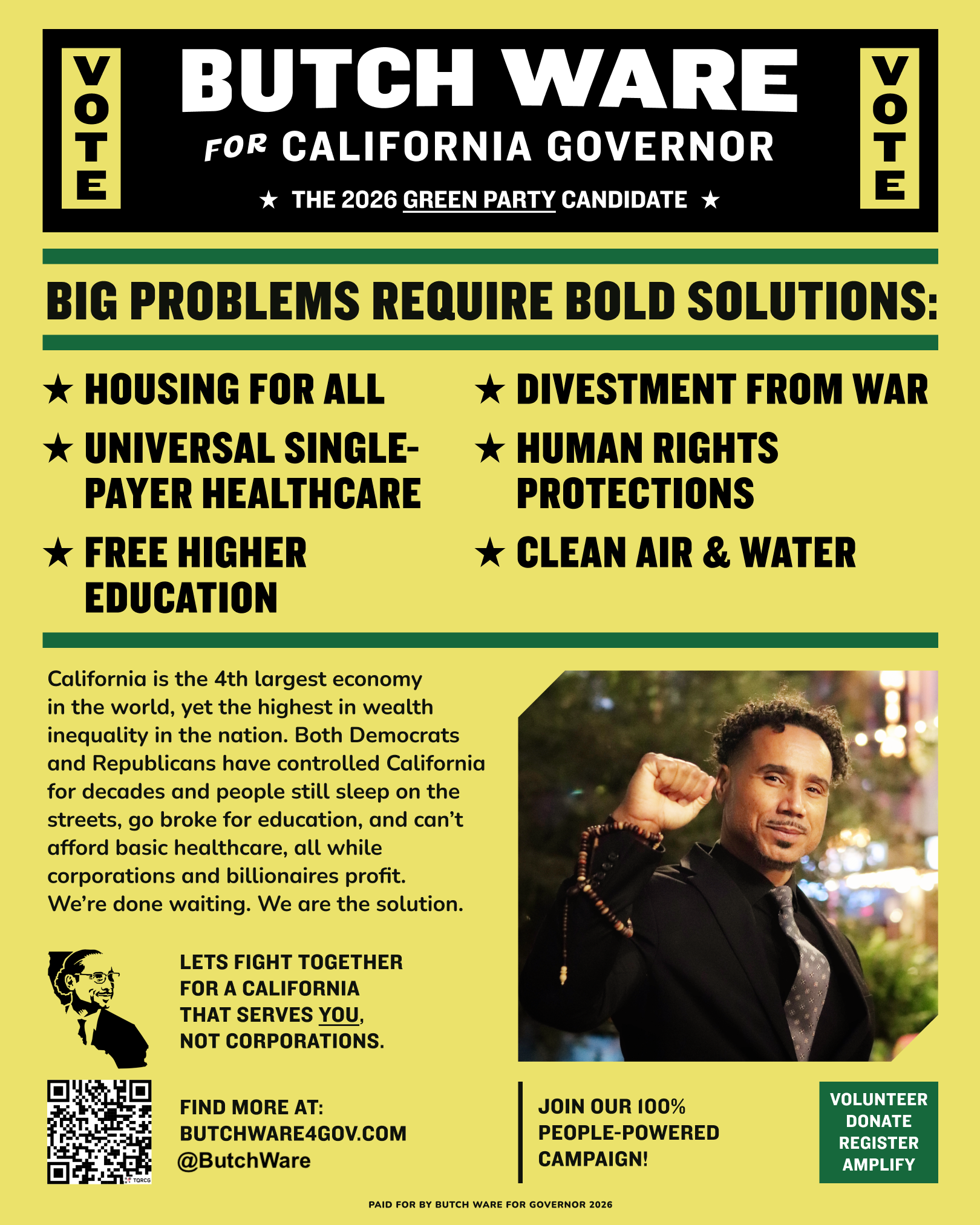 Dr. Ware is not a career politician. He enters politics as a voice forged in scholarship and movements, compelled by the urgency of this moment to help turn insight into action. After serving as the Green Party’s Vice-Presidential nominee in 2024, he is now running for Governor with a renewed Green politics aimed at breaking the gridlock of the two-party duopoly. As a Californian, an educator, and a father, Butch is deeply invested in the future of the state he calls home. His vision is bold and simple: to reclaim government from corporate power and secure a just and prosperous future for California.